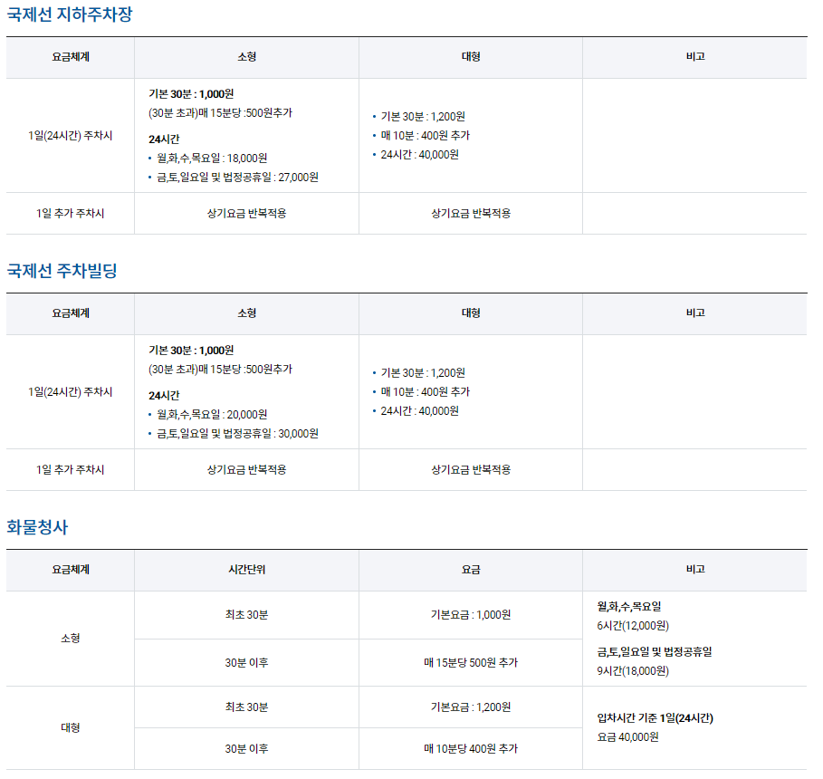 24시간 주차시 월,화,수,목은 18,000원 ~20,000원이며, 금,토,일 및 법정 공휴일에는 27,000원~30,000원 정도 드는 것을 알 수 있다.