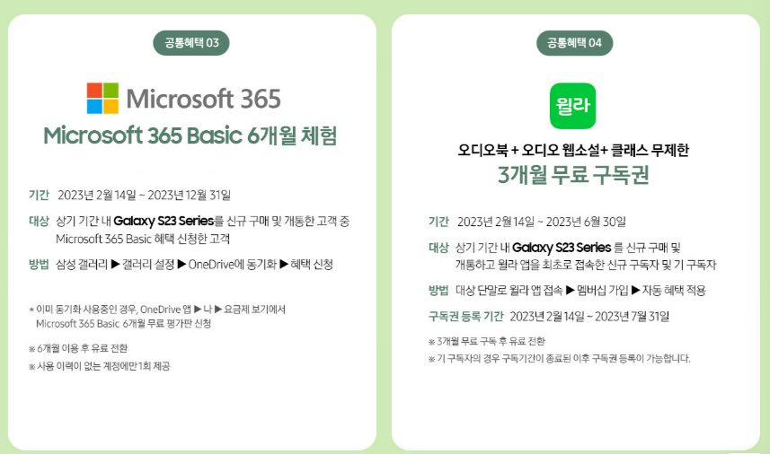 또한 사전구매에 참여하지 못하였더라도 일반 구매자도 사전구매자와 동일하게 갤럭시 워치5 30% 할인 쿠폰과 유튜브 프리미엄 5개월 무료 체험, 마이크로소프트 365 베이직 6개월 체험권, 윌라 3개월 무료 구독권을 제공합니다.