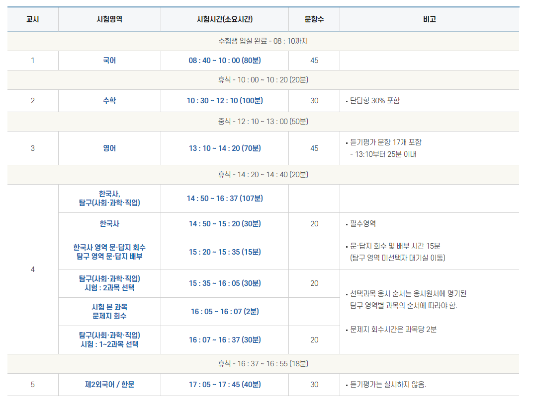 2022년 11월 17일 목요일 시행되는 2023학년도 수학능력시험 일정 및 시간표 그리고 유의사항 등 관련 정보를 알아보고자 합니다.