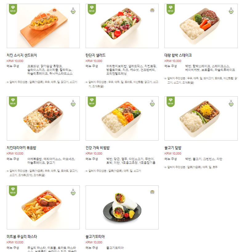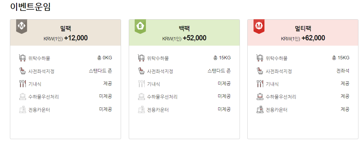 우리는 위탁수하물 구입을 해야하니 52,000원의 백팩을 주목하겠지만 기내식 빼놓을 수 없잖아요? 그럼 기내식 가격도 한번 봐볼까요? 하나에 다 10,000원에 추가금이 붙게 되네요. 그렇담 사전좌석지정 전좌석까지 가능하고 기내식까지 가능한 멀티팩을 선택하는 것이 더욱 이득이겠네요.
