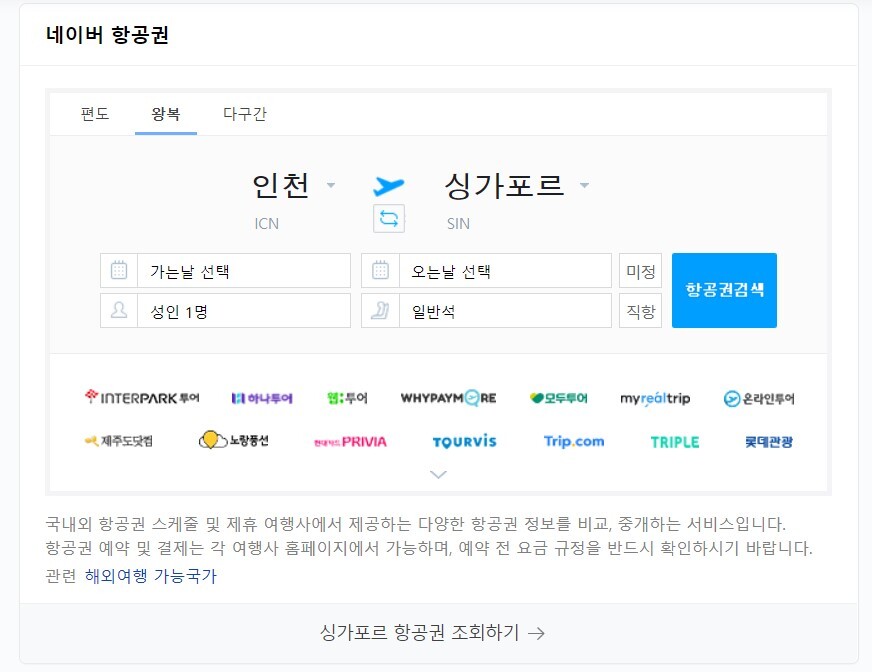 자, 항공 예약의 룰은 무엇이다? 그것은 바로 네이버 항공권 조회입니다. 요즘 항공권 어플 아주 많이 있지만 저는 아직 이만한 걸 보지 못해서 이걸 쓰는 것이니 만약 더 좋은 것이 있다면 꼭 알려주세요. 왜냐면 저도 싸게 가고 싶거든요. 일단 네이버 검색창에 '싱가포르 항공권'이라고 검색하게 되면 맨 위에 있는 파워링크를 지나치면 딱 이 화면이 바로 나오게 됩니다. 이 화면에서 가는 날, 오는 날, 그리고 인원을 넣고 검색하게 되면 바로 가격순으로 가장 저렴한 항공편부터 나옵니다. 하지만 이곳에서 금액에 혹해 바로 그냥 구매를 해버리시면 안 됩니다.