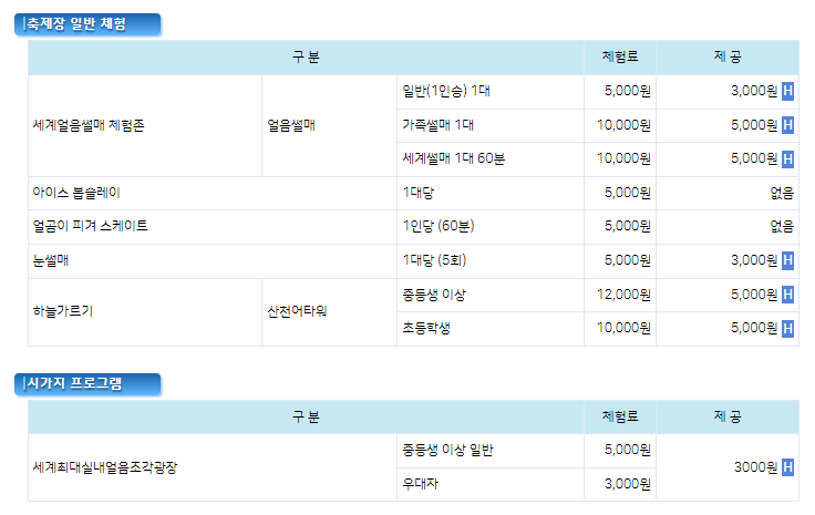 아래의 2023 체험 가격표를 확인하시면 더욱 도움되실 것 같습니다.