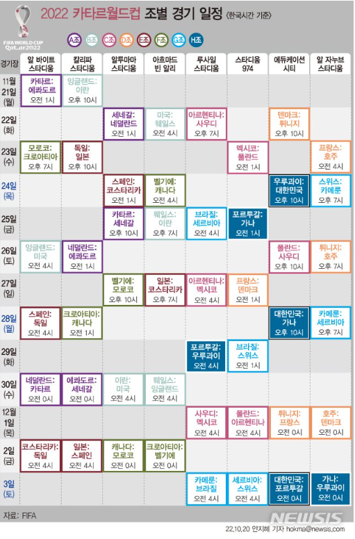 우리나라는 H조로서 11월 24일 목요일 22시(한국시간 기준)에 우루과이와 에듀케이션 시티 스타디움에서 본선 첫 경기를 치루게 되며 이후 11월 28일 월요일 22시에 가나와 두번째 경기를, 12월 3일 토요일 00시에 포르투갈과의 경기를 통해 16강 진출이 결정되게 됩니다.