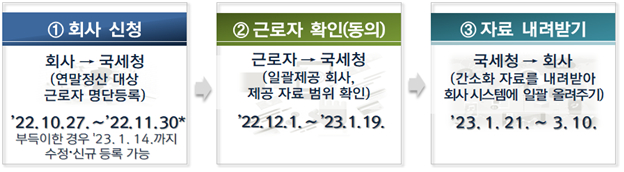 - 22.10.27~22.11.30.'간소화자료 일괄제공 서비스' 이용 희망 회사는 연말정산 대상 근로자 명단을 홈택스에 등록